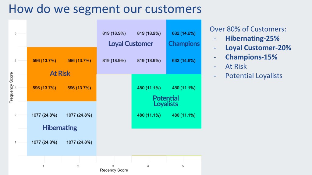 These metrics help identify the most valuable customers, those at risk of churn, and those who could potentially become top spenders.