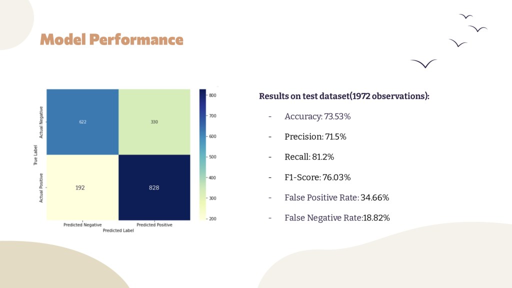 - Accuracy: While achieving an accuracy of 73.53%, there’s still room for improvement to reduce potential errors.